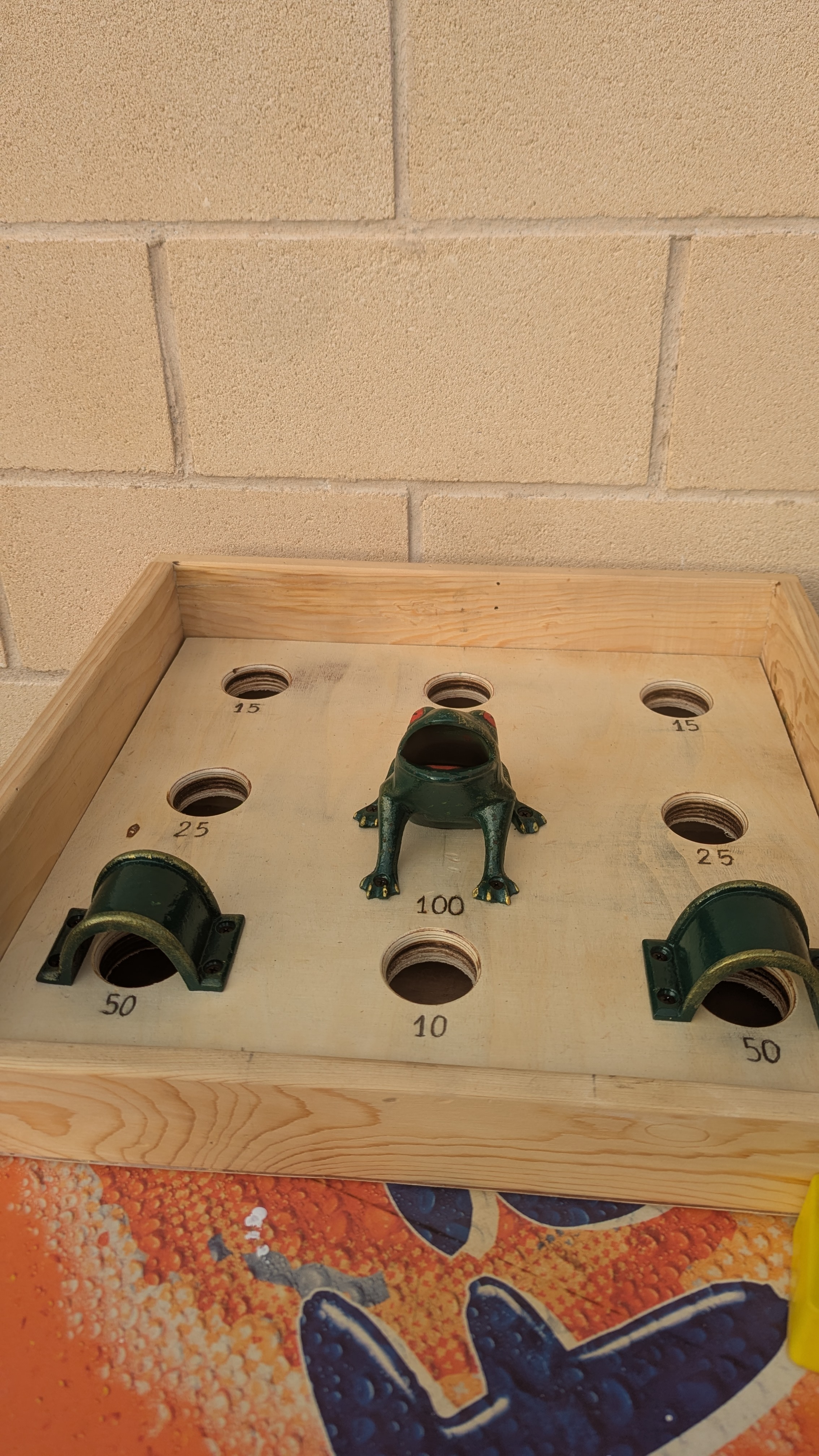 Consiste en un tablero con agujeros que tiene en el centro una rana metálica con la boca abierta. Cada agujero tiene un puntuación y la puntuación máxima se consigue metiendo la ficha por la boca de la rana. Se emplean diez fichas y gana el que consigue más puntos en un número determinado de tiradas.
